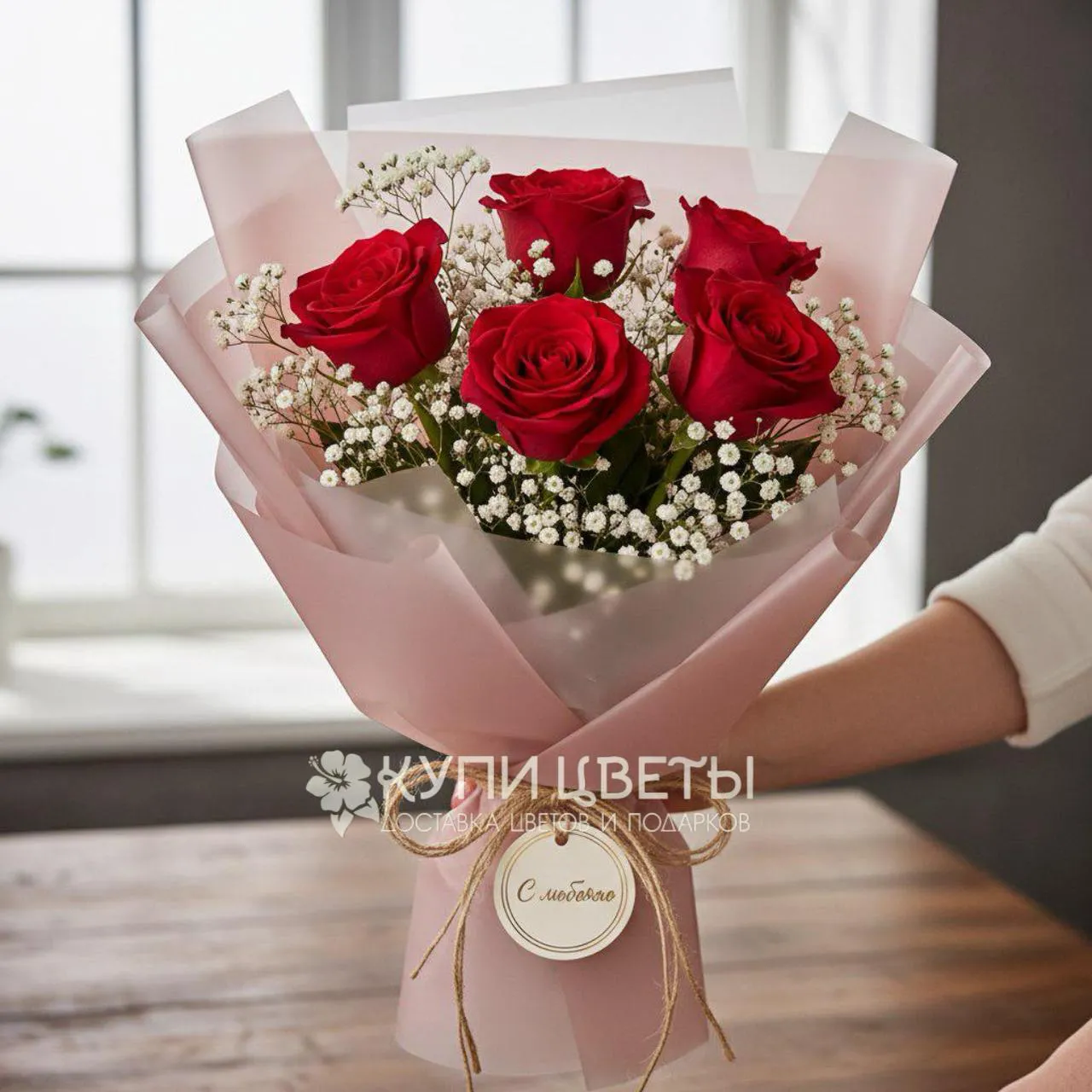5 роз, гипсофила, упаковка