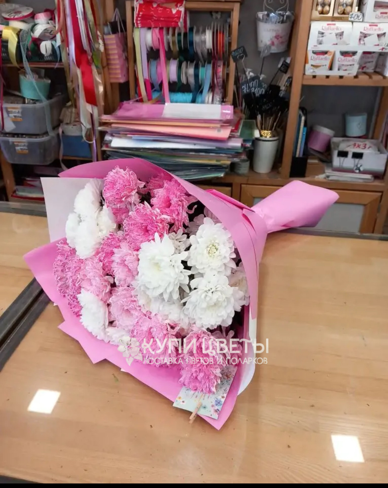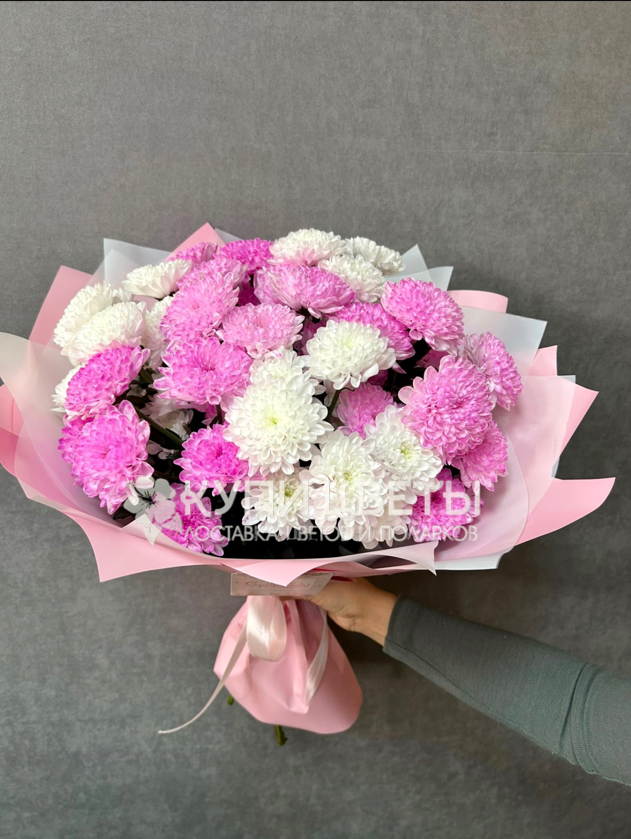Состав букета: Кустовые хризантемы,упаковка,лента