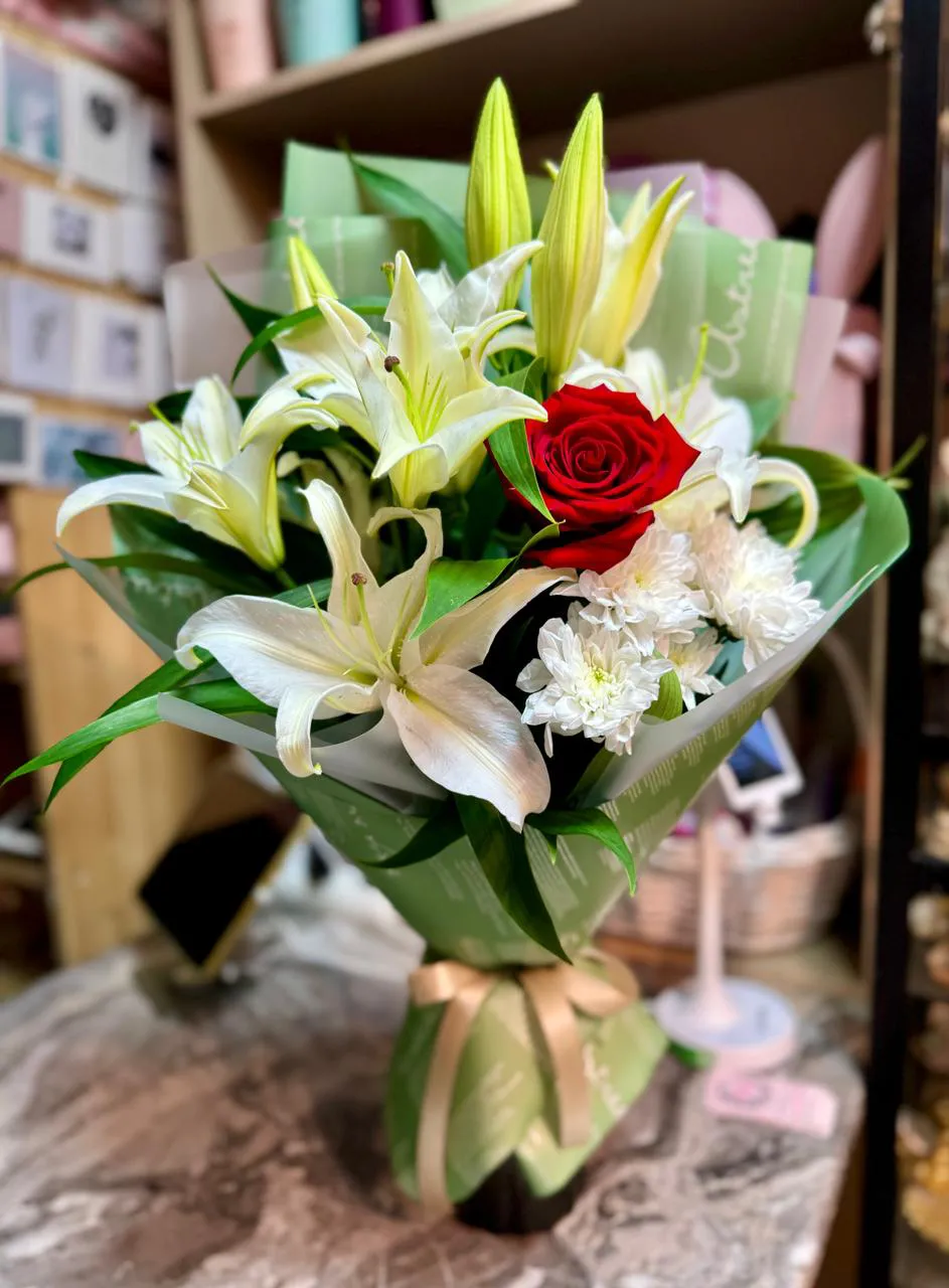 Этот великолепный букет станет настоящим произведением искусства, где каждый цветок играет свою уникальную роль. В центре композиции ярко распустилась красная роза, символизирующая страсть и любовь. Её бархатные лепестки излучают тепло и нежность, привлекая взгляд и вызывая восхищение.