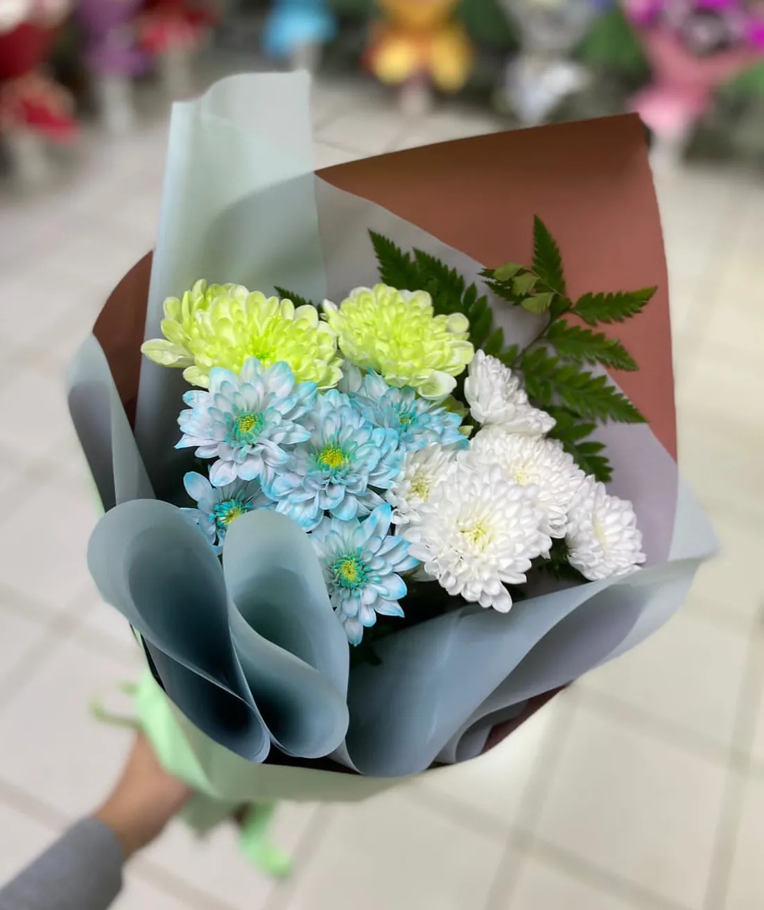 Букет из голубых, белых и желтых кустовых хризантем — это волшебное сочетание цветов, которое привлекает внимание своим ярким и оригинальным исполнением. Голубые хризантемы, словно кусочек ясного неба, придают композиции ощущение спокойствия и умиротворения. Их насыщенный цвет контрастирует с нежностью белых хризантем, олицетворяющих чистоту и свежесть. Желтые цветы словно солнечные лучи, добавляют живость и радость в этот великолепный ансамбль.