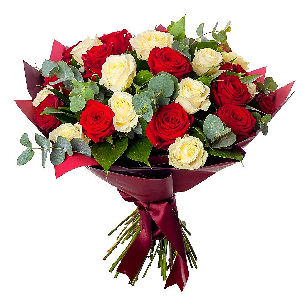 Состав букета: белые и красные розы, зелень, упаковка, лента