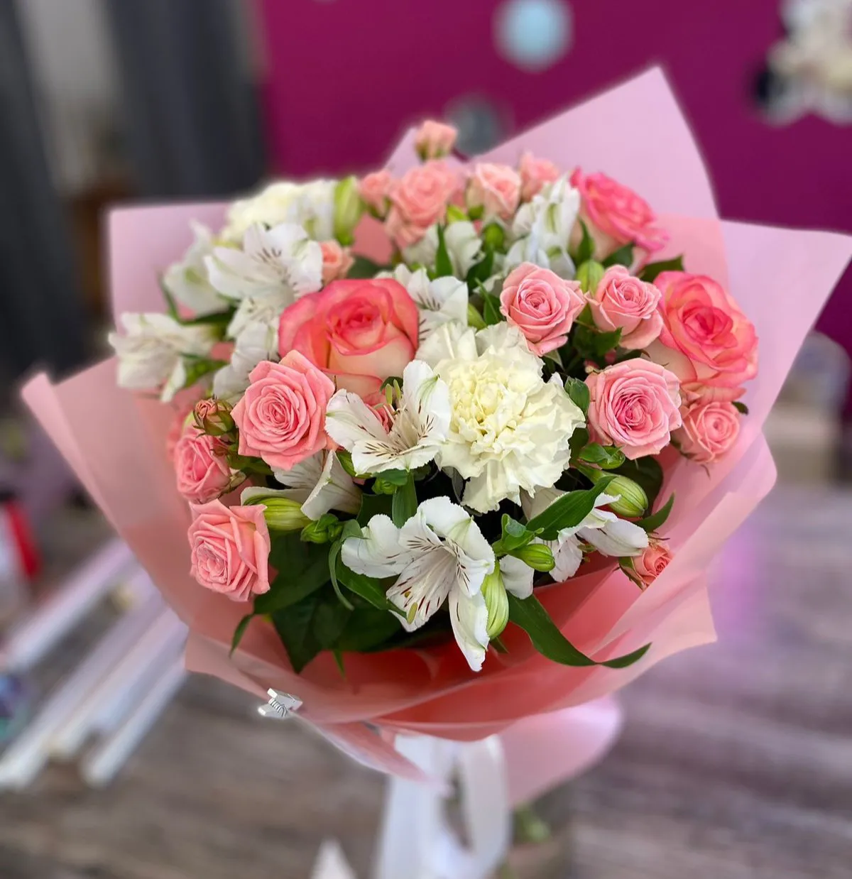 Этот роскошный букет состоит из нежных розовых роз, которые излучают утончённость и романтику. Их бархатистые лепестки гармонично сочетаются с изящными кустовыми розами, добавляющими объема и текстуры. Белые альстромерии, как яркие звёзды, прокладывают путь свету, благодаря своей лёгкости и воздушности, а их изящные цветки добавляют свежести и игривости композиции. Завершают этот великолепный ансамбль белые гвоздики, которые придают букету нежный и трогательный вид. Вместе все эти цветы создают гармоничное звучание, вызывающее ассоциации с чистотой, нежностью и безмятежностью.