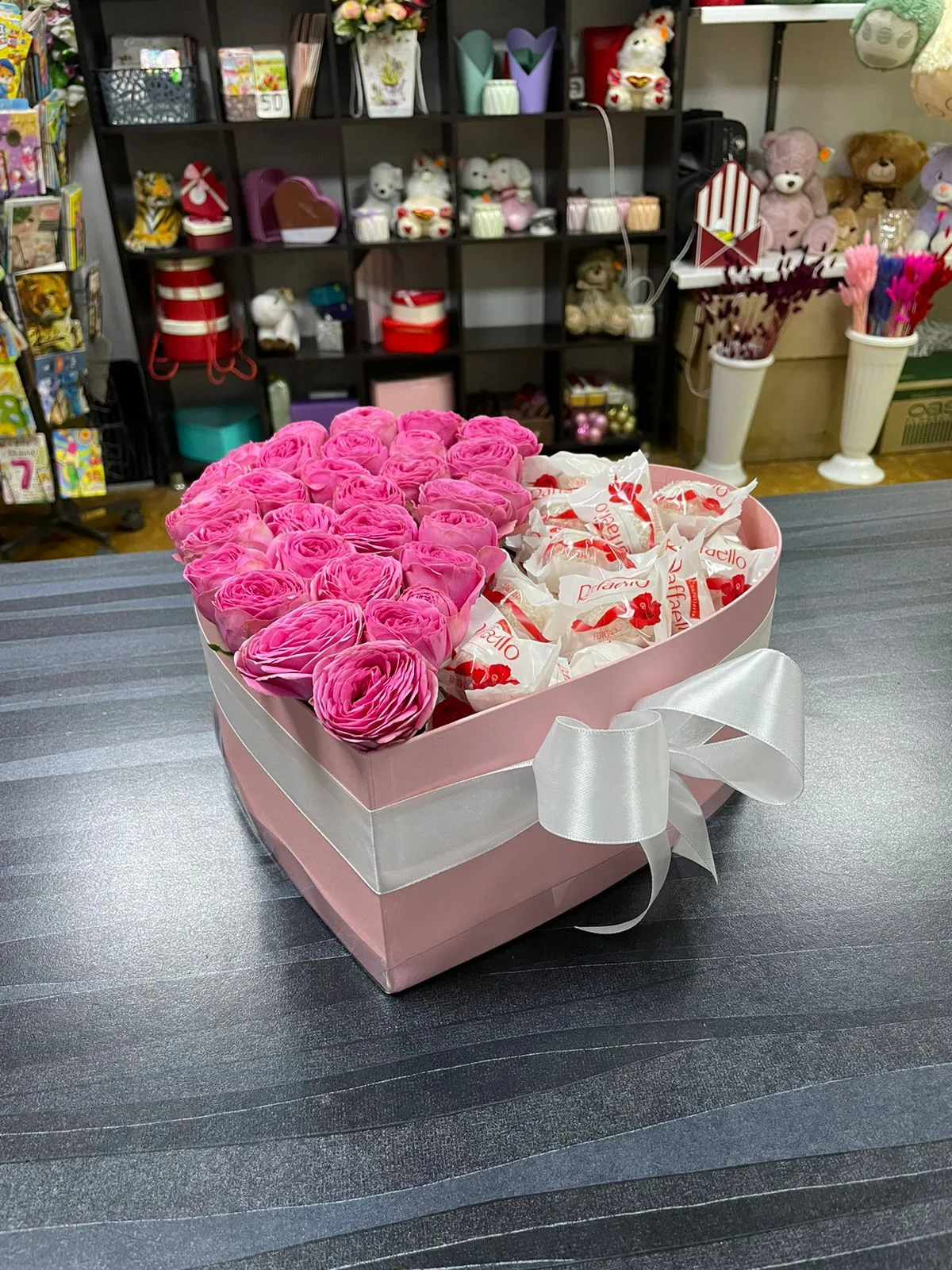 Розовые розы в коробке сердечком и всеми любимые Рафаэлло. Самая романтичная композиция .