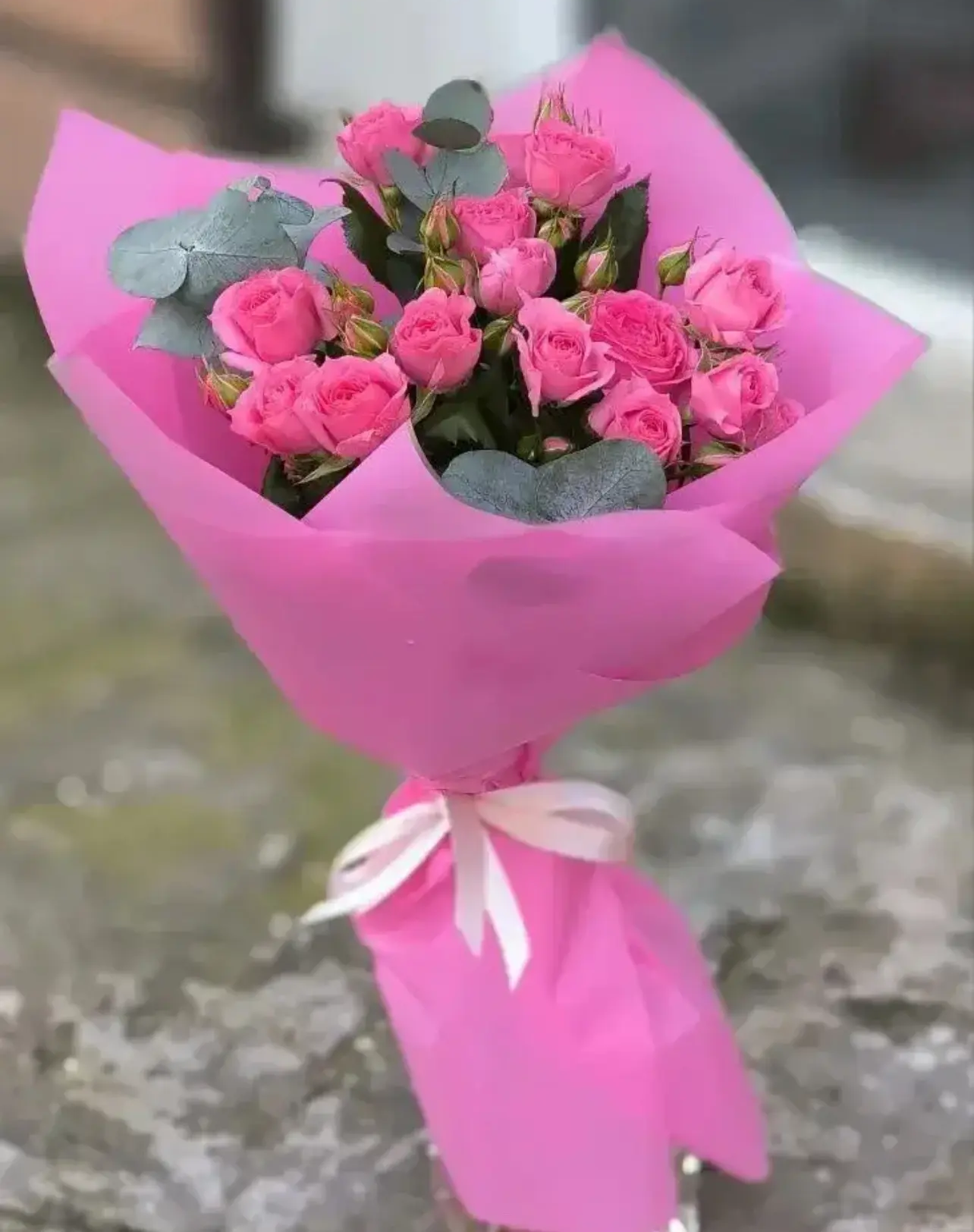 Нежный и в то же время выразительный букет из трёх ярко-розовых кустовых роз, дополненный изящными веточками эвкалипта, - это гармония свежести, стиля и природной красоты. Пышные соцветия роз создают ощущение объёма и лёгкости, а серебристо-зелёный эвкалипт придаёт композиции утончённый аромат и современный акцент. Такой букет идеально подойдёт для знака внимания, комплимента или украшения особого момента