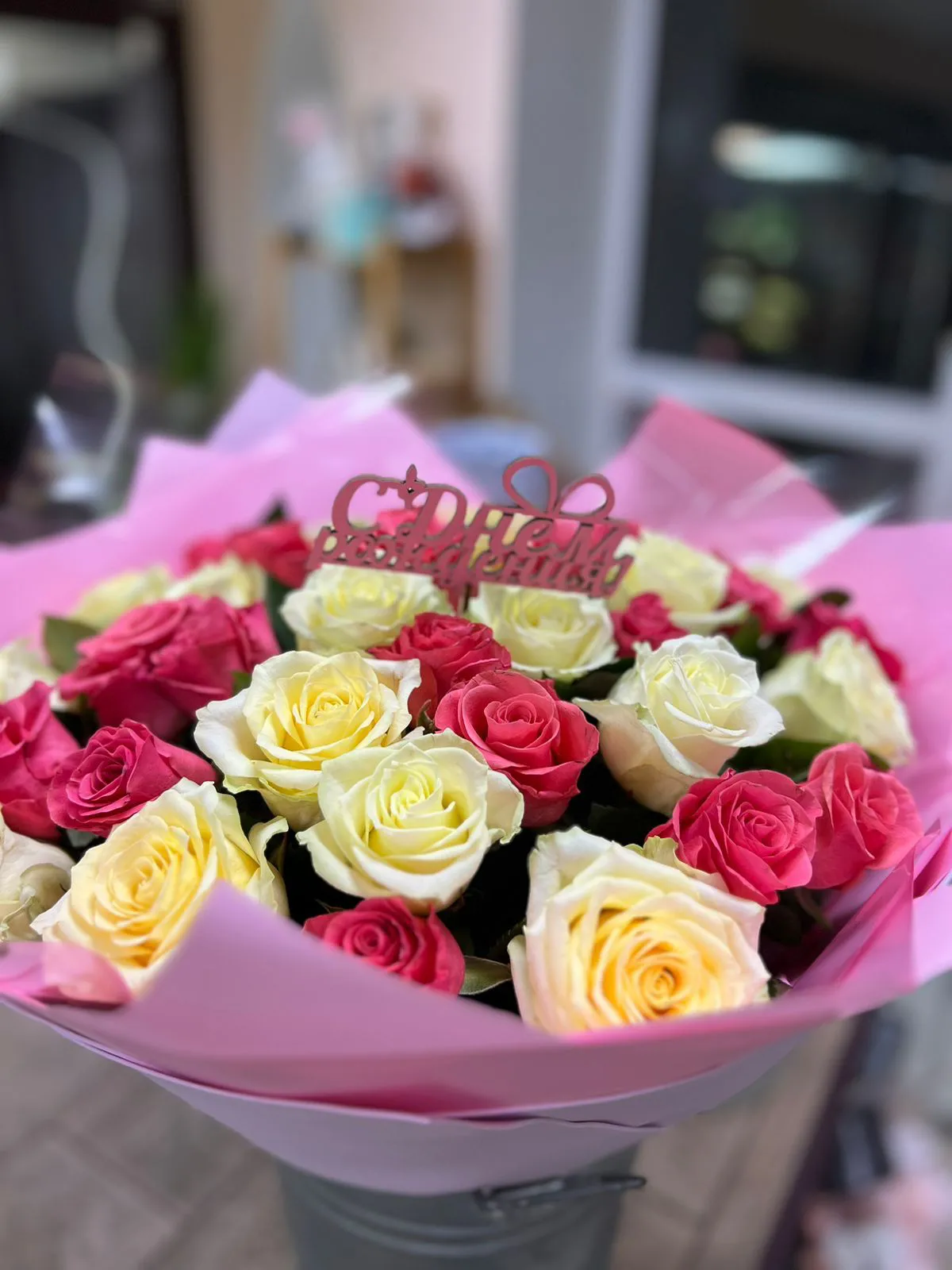 • Средний - роза - 9 шт., зелень, топпер, упаковка, лента