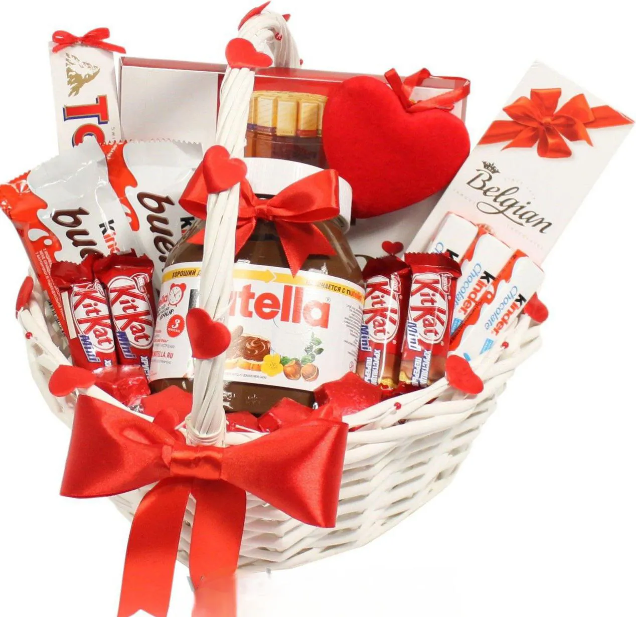 Состав: Nutella банка, Kinder шоколад (100 гр.), Kinder Bueno - 3 шт., Kinder Country - 3 шт., шоколадки -KitKat - 4 шт., коробка конфет., корзина