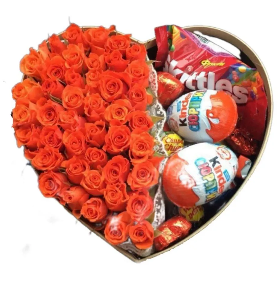 Каждая сладость, будь то шоколад, конфеты или другие лакомства, привнесет в ваш подарок сладкий вкус любви. Розы, которые обрамляют сладости, добавляют изысканности и красоты. Их аромат напомнит о теплых чувствах и нежных мгновениях.